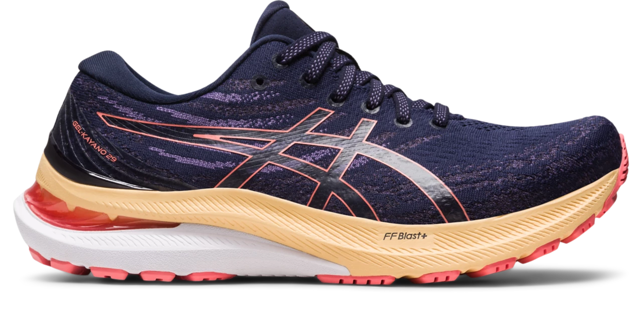 The GEL-KAYANO® 29 shoe creates a stable running experience and a more responsive feel underfoot. Featuring a low-profile external heel counter, this piece comfortably cradles your foot with advanced rearfoot support. We also updated the midsole with FF BLAST™ PLUS cushioning. This helps keep the shoe lightweight while creating a more energized rebound in each step. A LITETRUSS™ stability feature is placed on the midsole’s inside angle. It’s designed to help keep your foot from rolling too far inward during your stride.