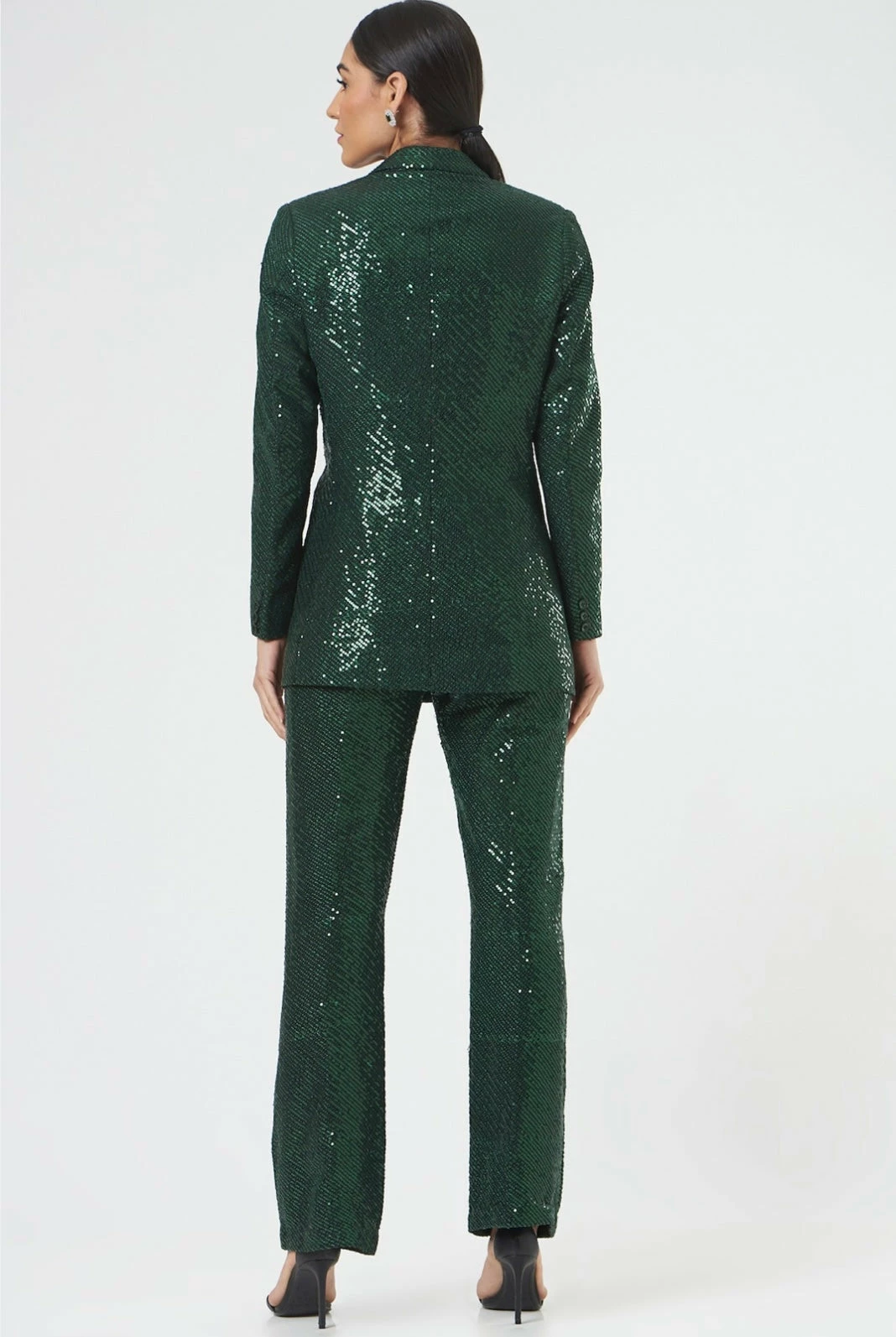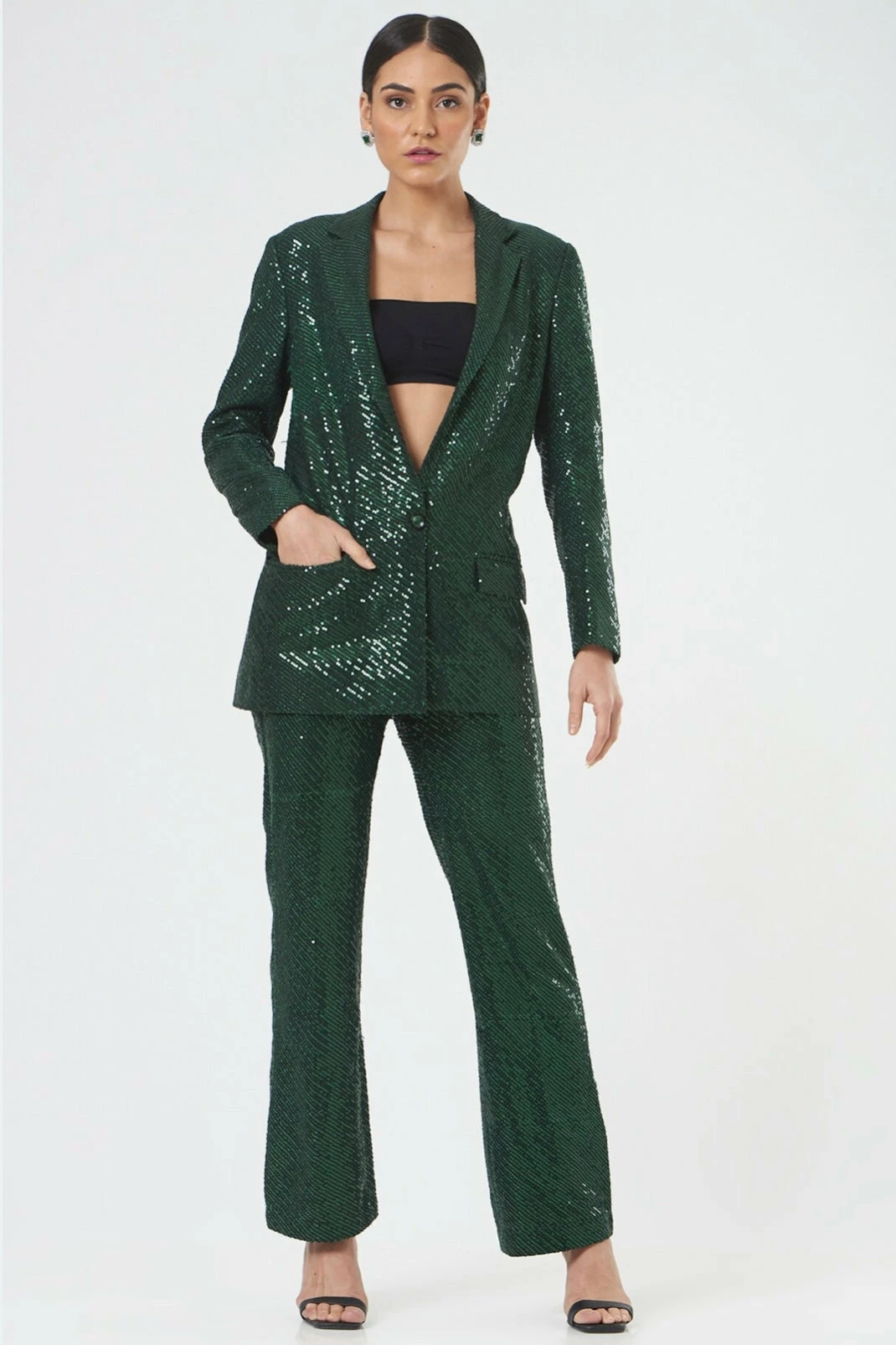 Our green Sequin Blazer pant suit will have you turning heads with its glittering aura and a plunging neckline for that FIRST DATE, this piece is love at first sight!!