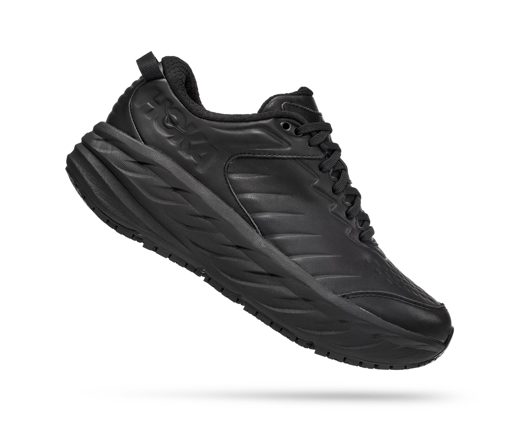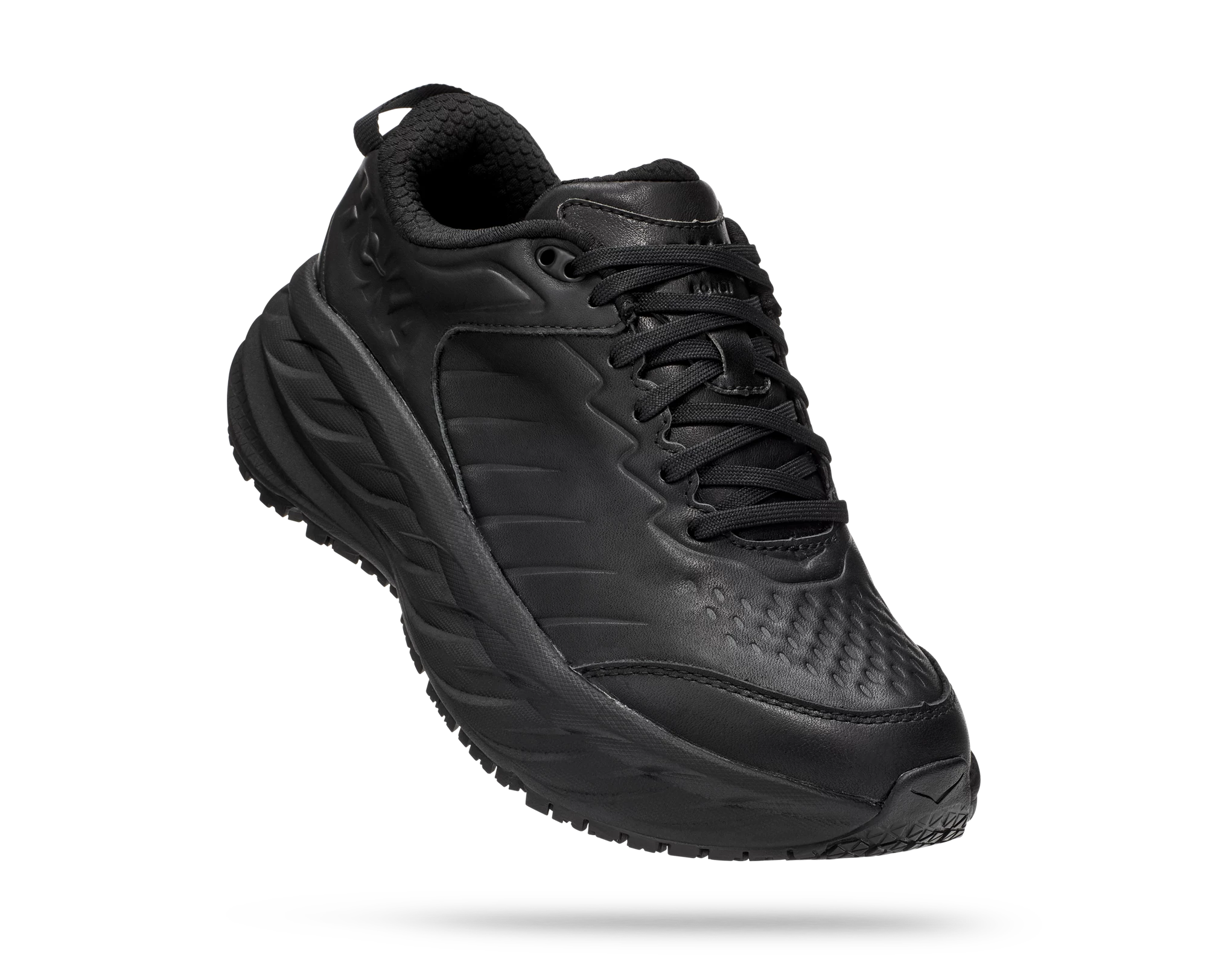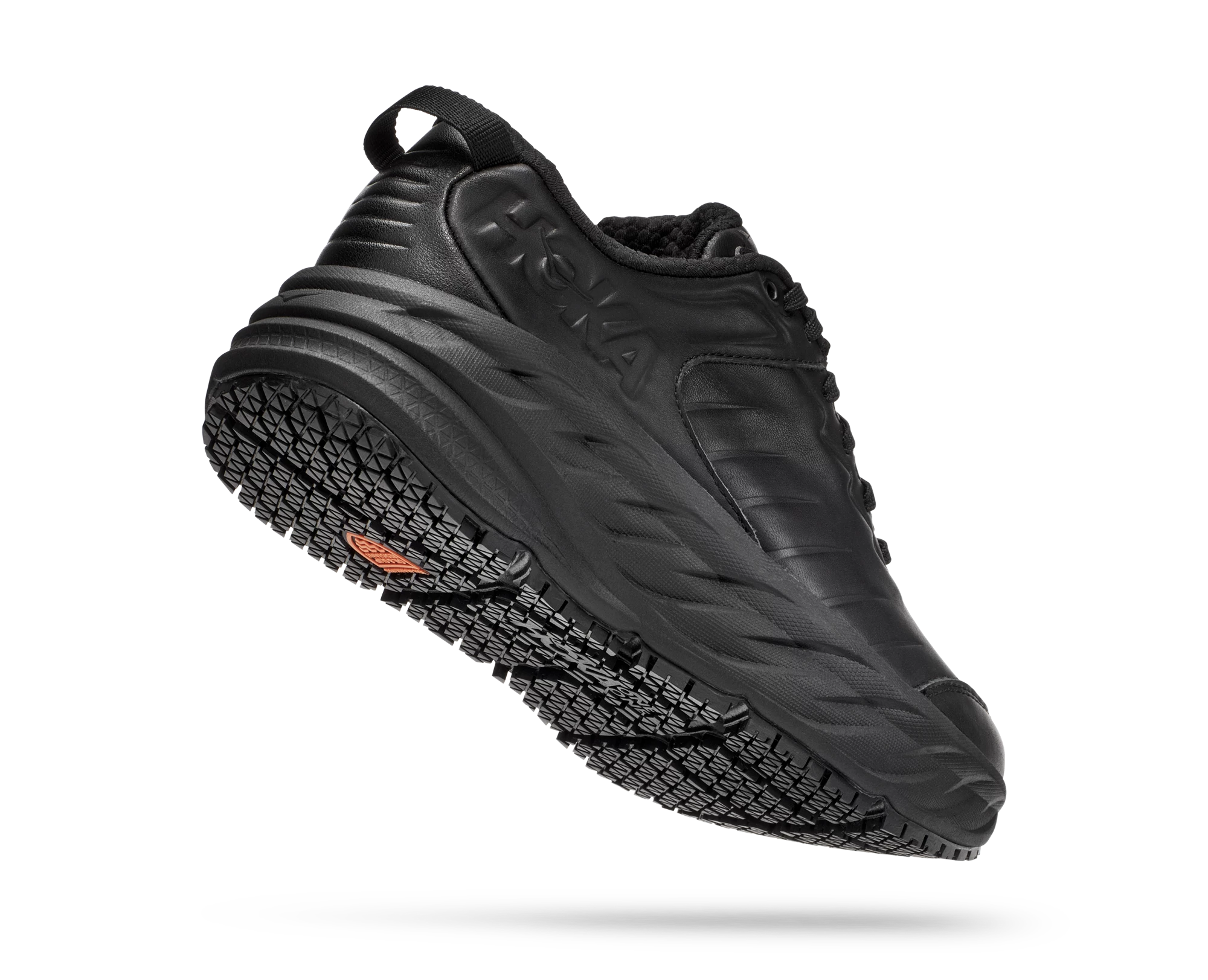 One of the first line extensions of the beloved Bondi family, the new Bondi SR takes the most cushioned shoe in the HOKA road-shoe lineup and reworks the silhouette to handle the demands of daily life. Engineered with an EVA midsole for plush, all-day cushioning, this workplace warrior has been updated with water-resistant leather and a slip-resistant outsole. Boasting a proprietary outsole compound tested against industry standards, the Bondi SR features an ultra-grippy, full ground contact rubber that stands up to the service industry and medical field alike.