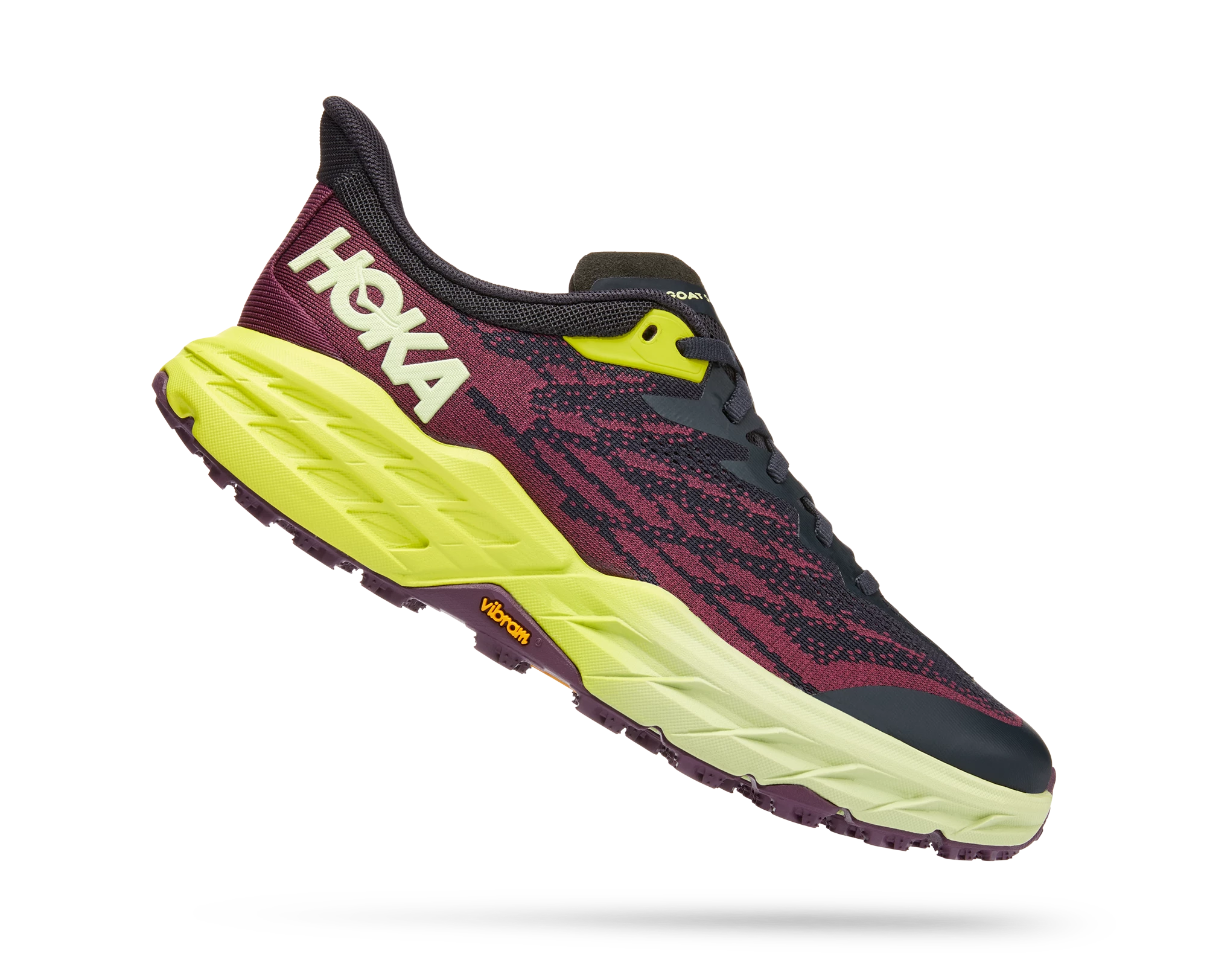 A workhorse designed for technical trails, the Speedgoat returns with less weight and more traction than ever before. A new shoe from outsole to laces, this trail beast is updated with Vibram Megagrip with Traction Lug for enhanced grip on loose soil. Retaining the same stack height and rocker profile, the Speedgoat 5 employs a lighter midsole compound and heartier, double layer jaquard mesh to inspire confidence on any terrain.