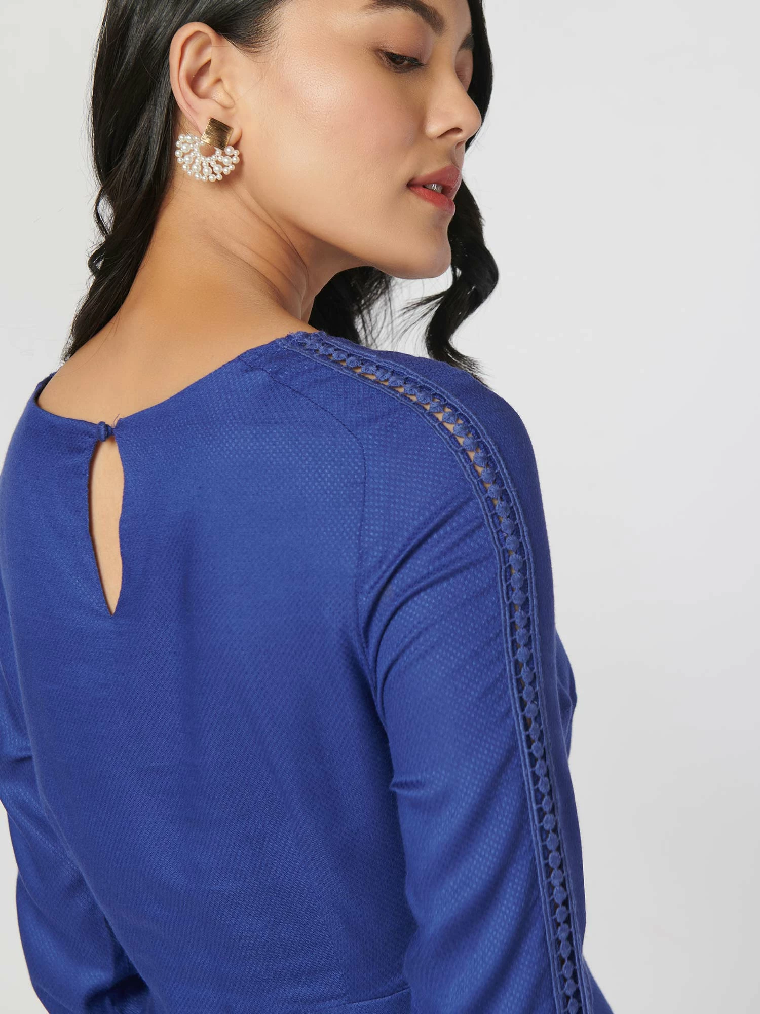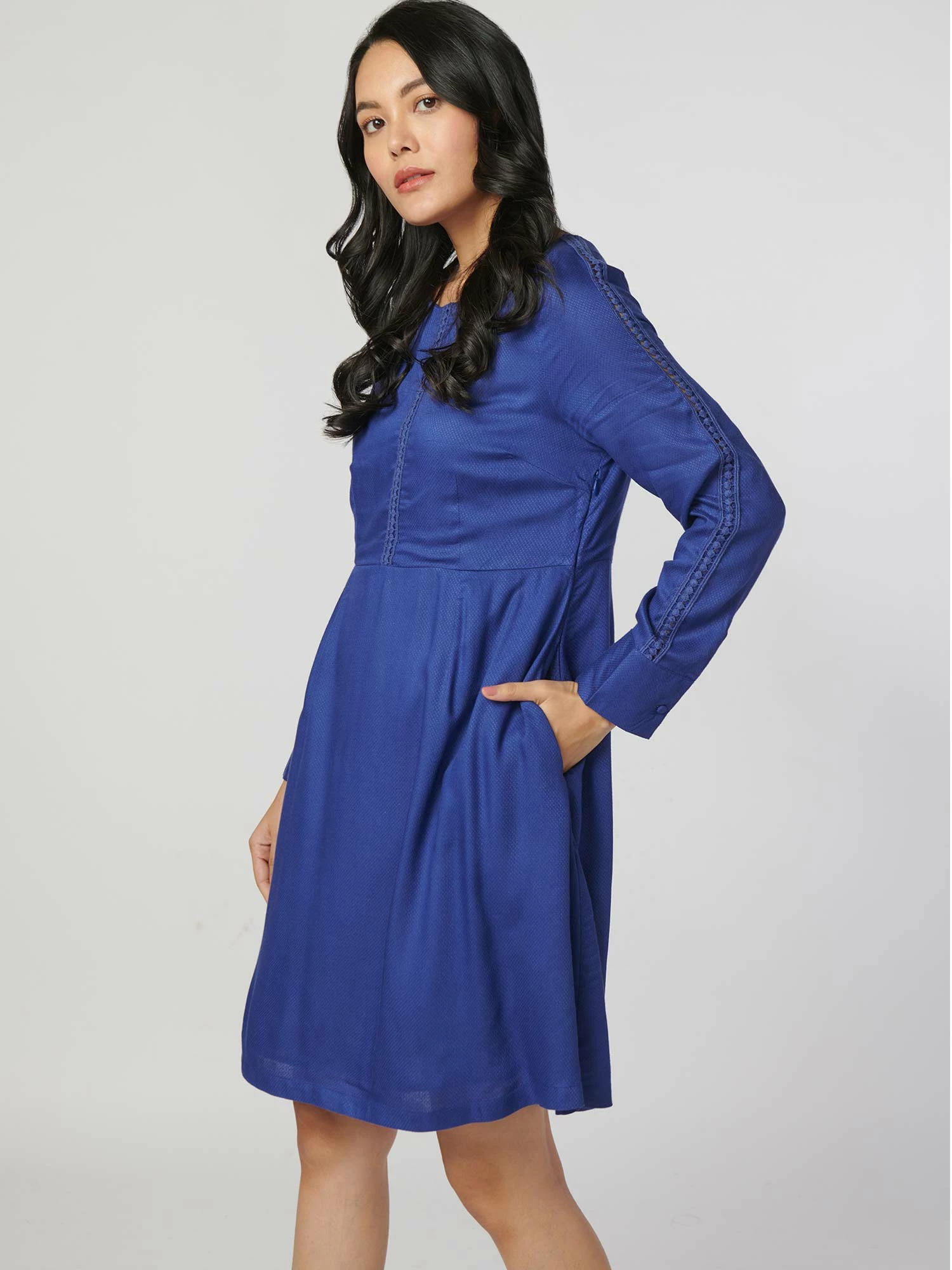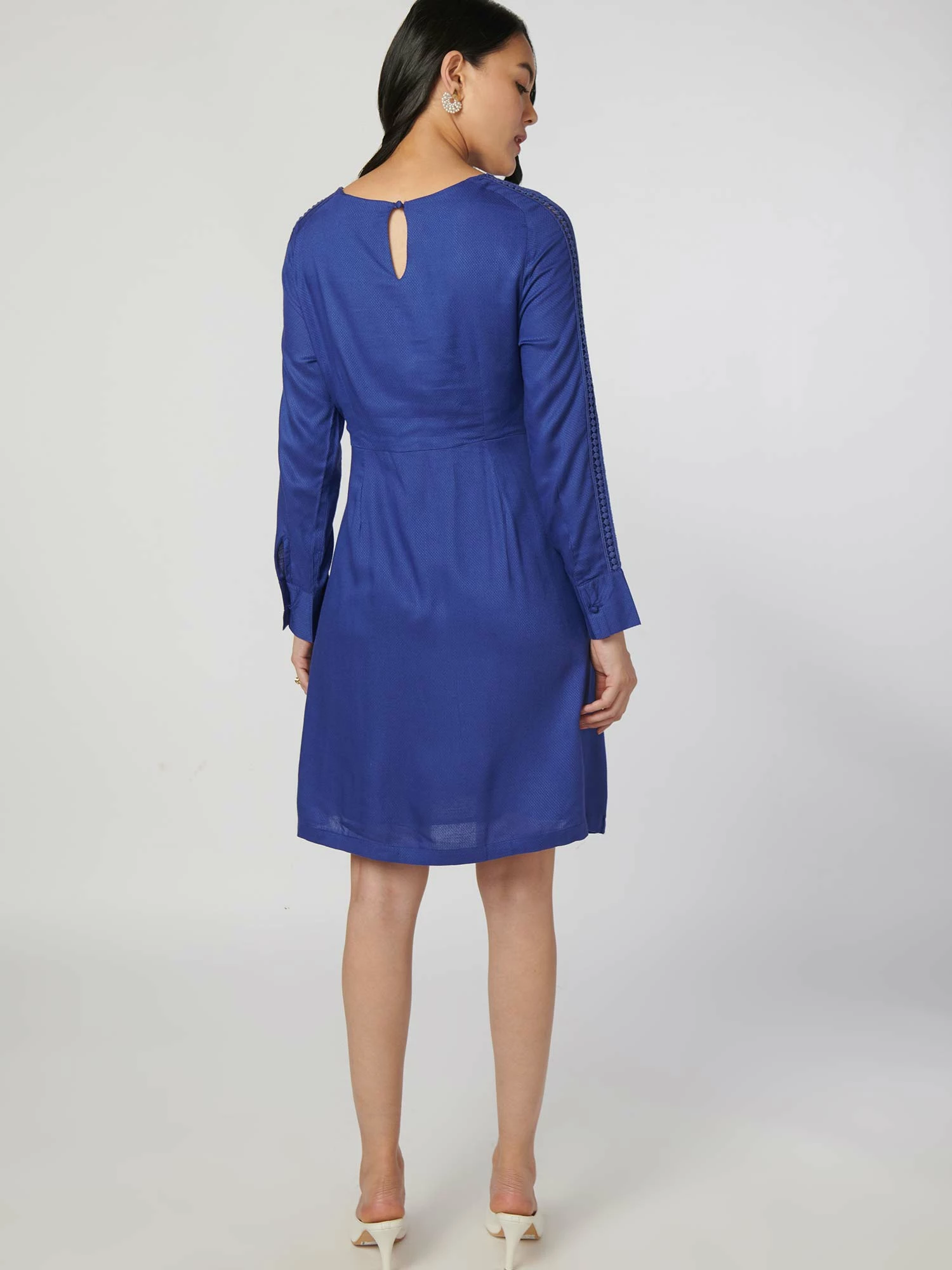 Simply outstanding would be the ideal description for this jacquard dobby, self-solid colour dress, and how it’ll make you look.It features a lace-inserted front and sleeve, comes in white and navy blue, and fits every body type well.