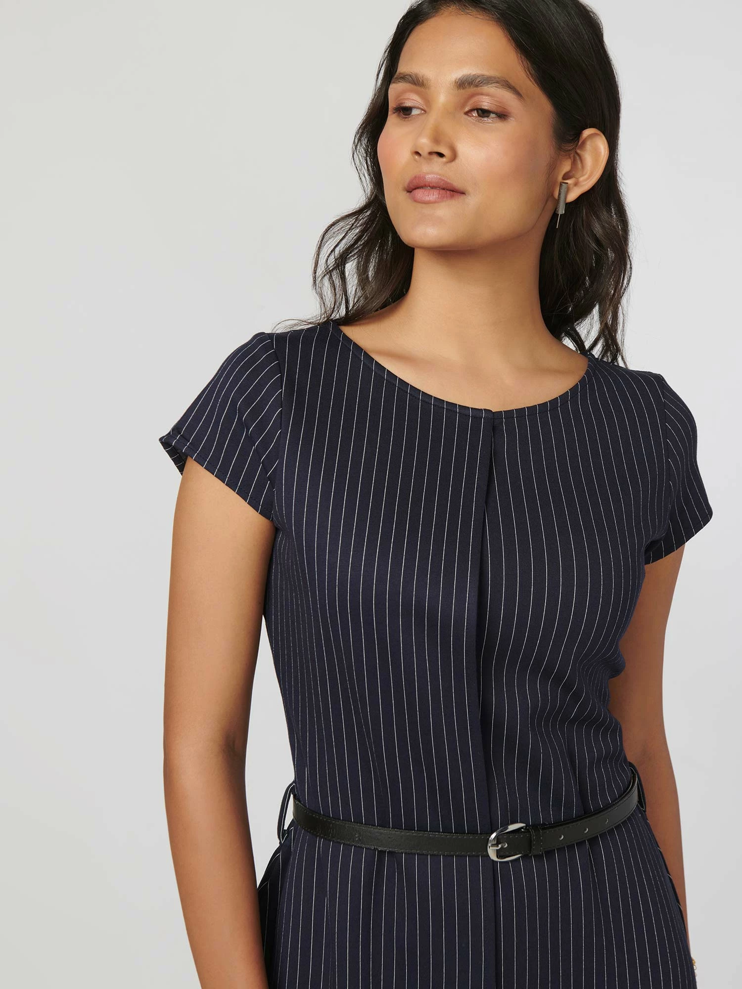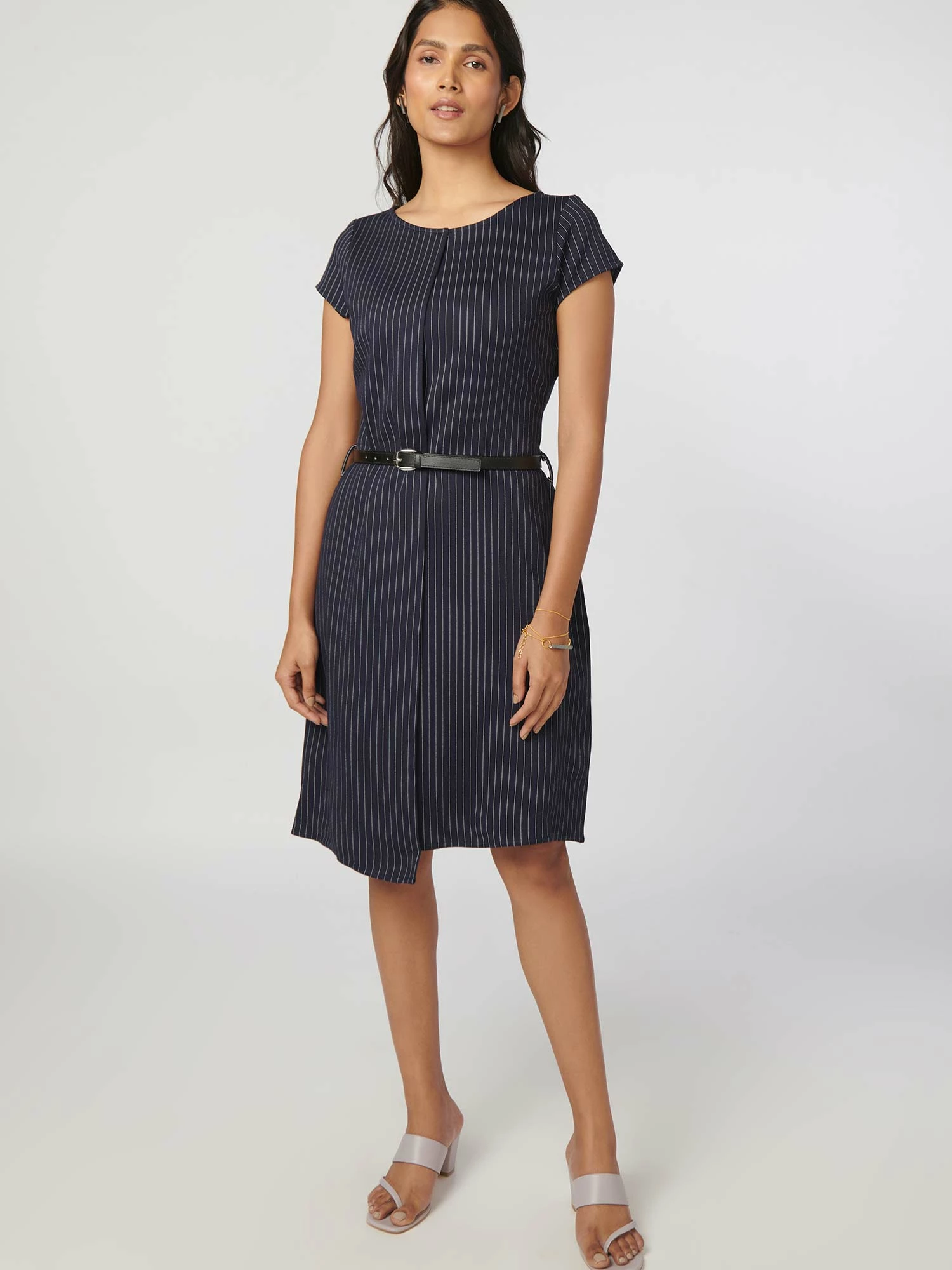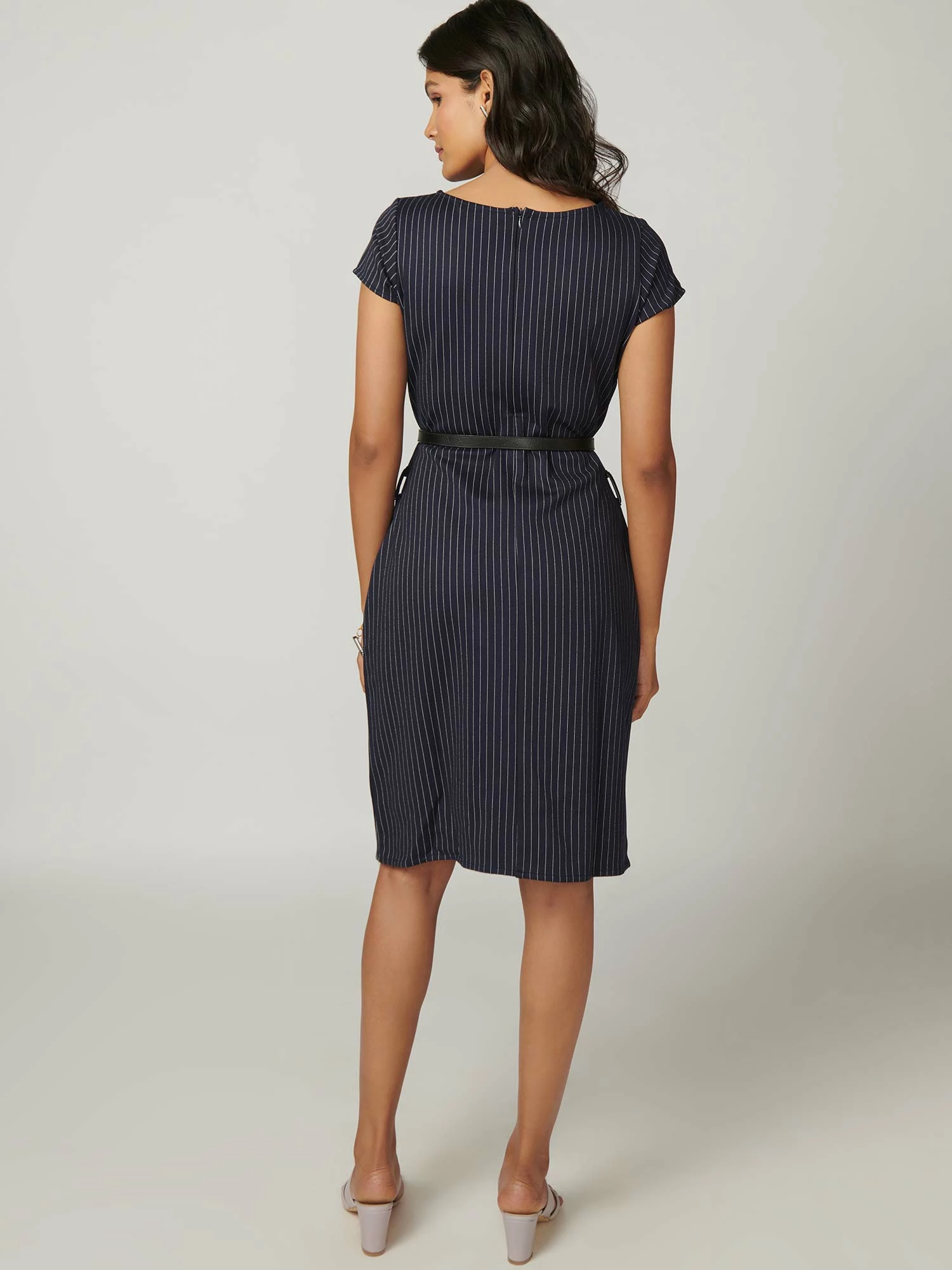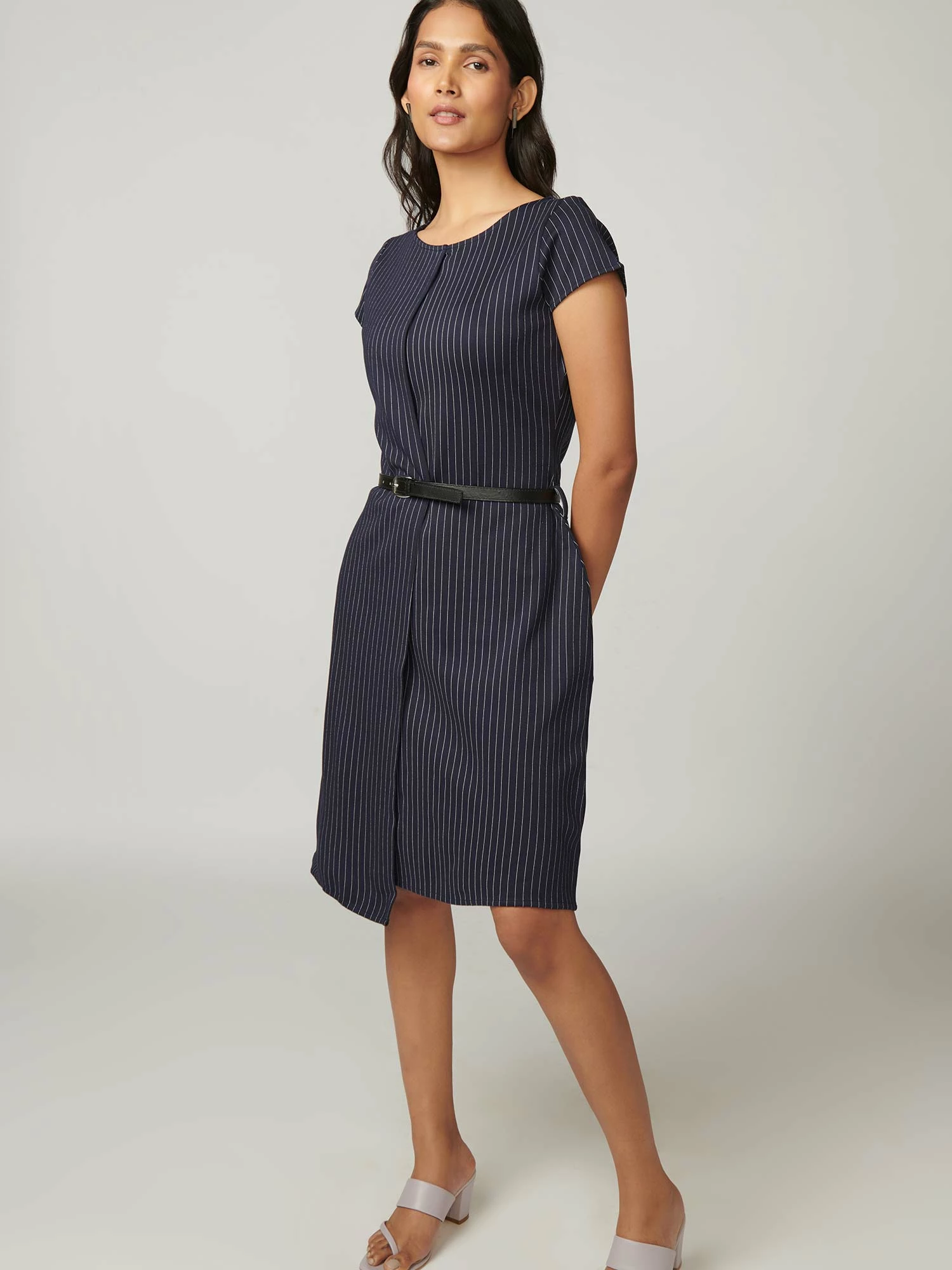Dress to express with this season-friendly navy blue dress from our Simplicity collection. This short sleeve, uneven hem, pinstripe sheath dress comes with a leather belt and is suitable for all body types.