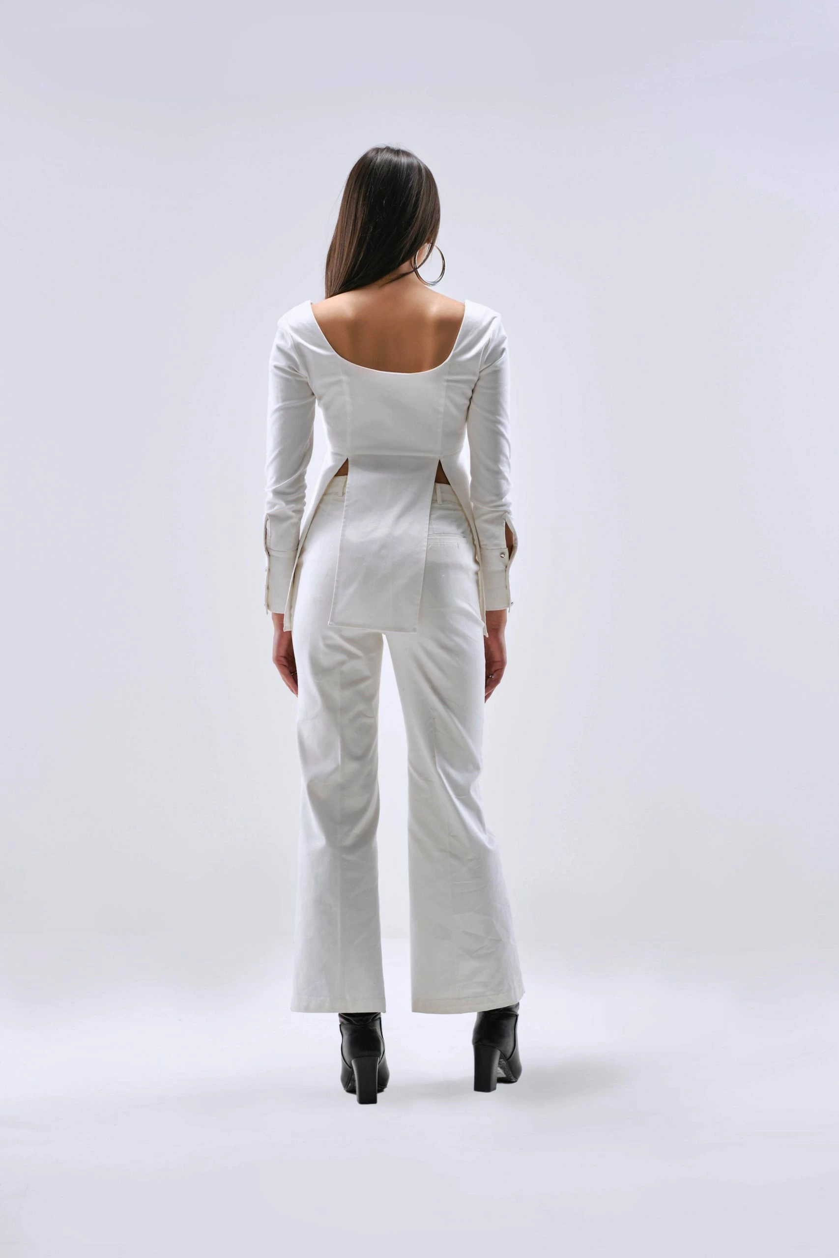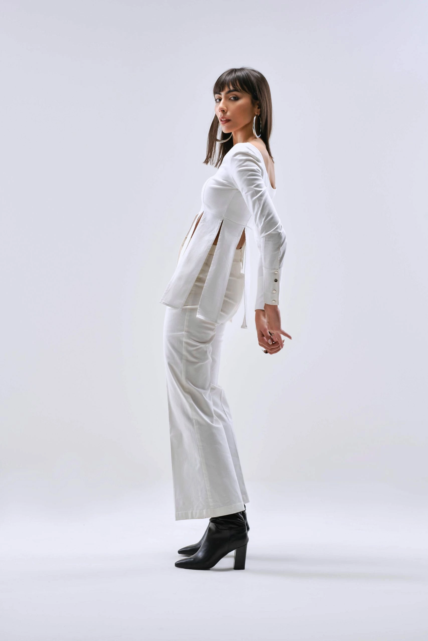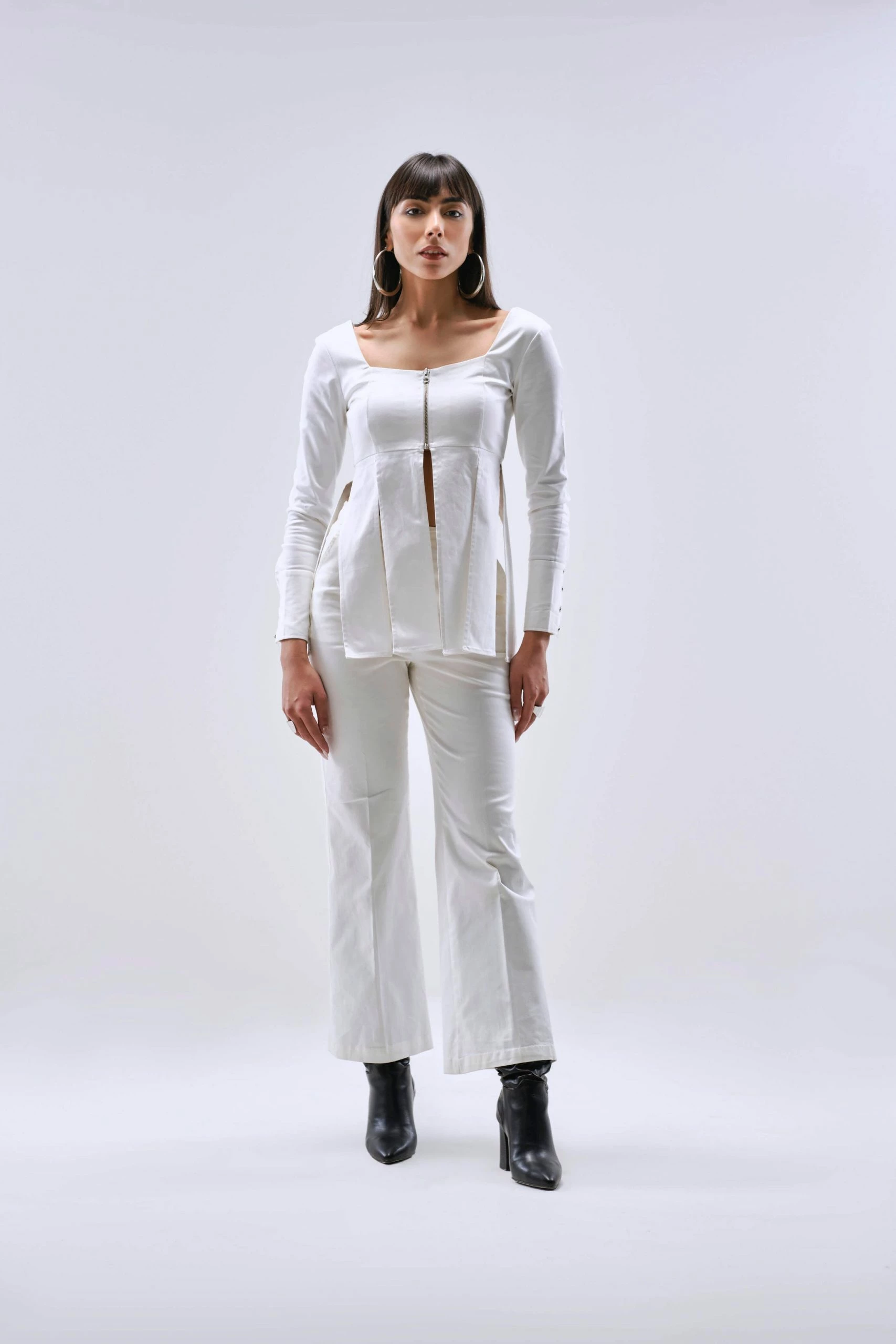 Fitted top that hugs the body from the upper half and flared out below the bust. Multiple slit details add drama to the silhouette. Front opening secured with a detachable metal zipper along with metallic buttons. Sleeves are styled with long cuffs.